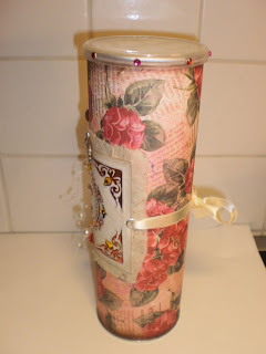 Tenk at en kjedelig pringels boks kan bli så lekker :) Nydelig papir du har brukt, og kjempestilig med perlene !Klem, Gry-Heidi :o)